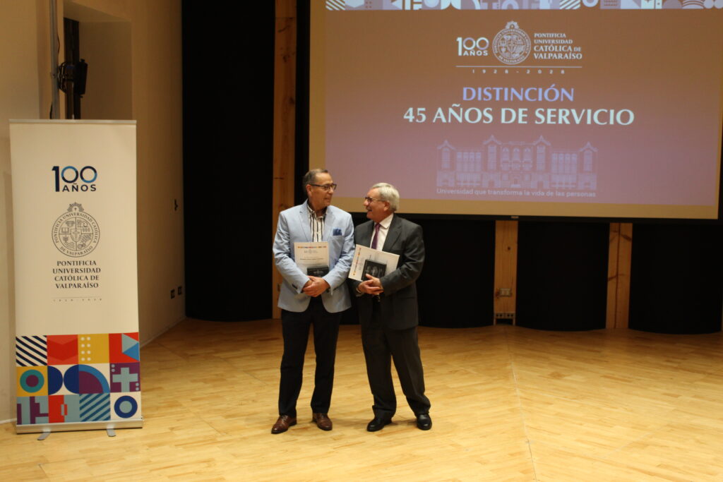 Durante la ceremonia, el vicerrector de Administración y Finanzas, Álex Paz, destacó el valor de esta instancia para la comunidad universitaria. “Creemos que ha sido un año muy positivo para la comunidad universitaria en su conjunto, con avances en distintos ámbitos del desarrollo institucional, pero también en lo que tiene que ver con el corazón de la PUCV, que son las personas”, sostuvo. Asimismo, relevó las mejoras en bienestar y condiciones de trabajo que han contribuido a consolidar a la Universidad como un espacio laboral estable y confiable en la región.